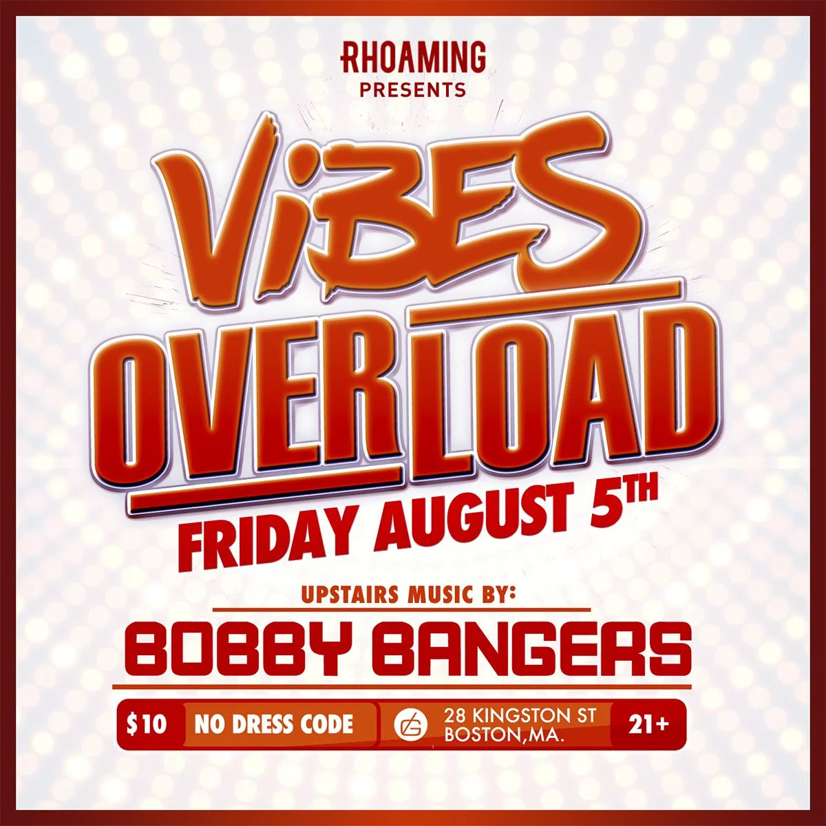 Vibes Overload Friday, August 5, 2016 9:30β―PM 11:59β―PM 21:30 23:59 Google Calendar ICS DJs: Bobby Bangers & DJ Brek.One downstairsMusic: Hip Hop, Reggae& Party Jams Ends at 2:00amΒ Β View fullsize