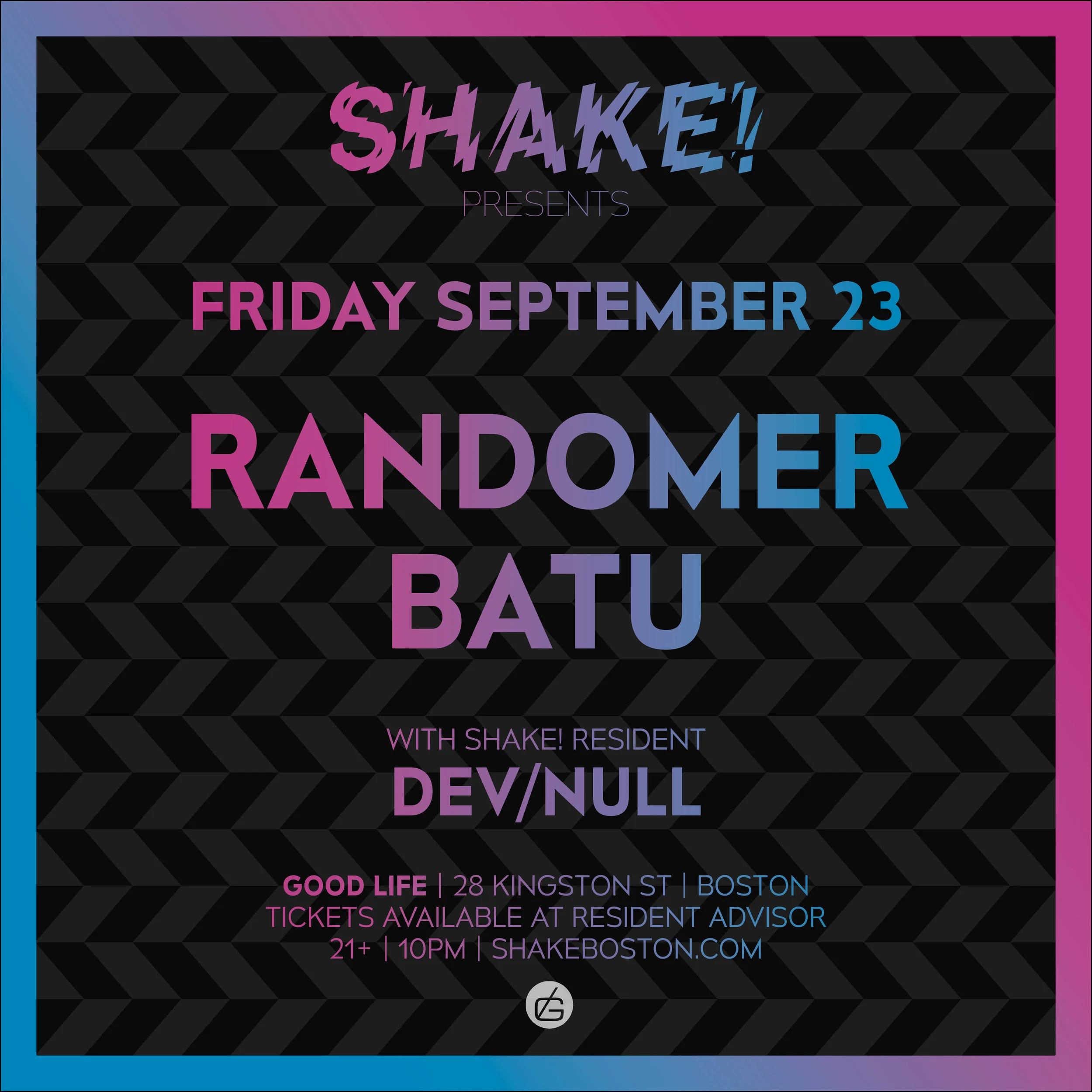 Shake Friday, September 23, 2016 9:30β―PM 11:59β―PM 21:30 23:59 Google Calendar ICS DJs: Randomer, Batu, Dev/Null + Reel Drama Music: House, Techno, Bass, Club + Hip Hop & Party Jams Ends at 2am View fullsize