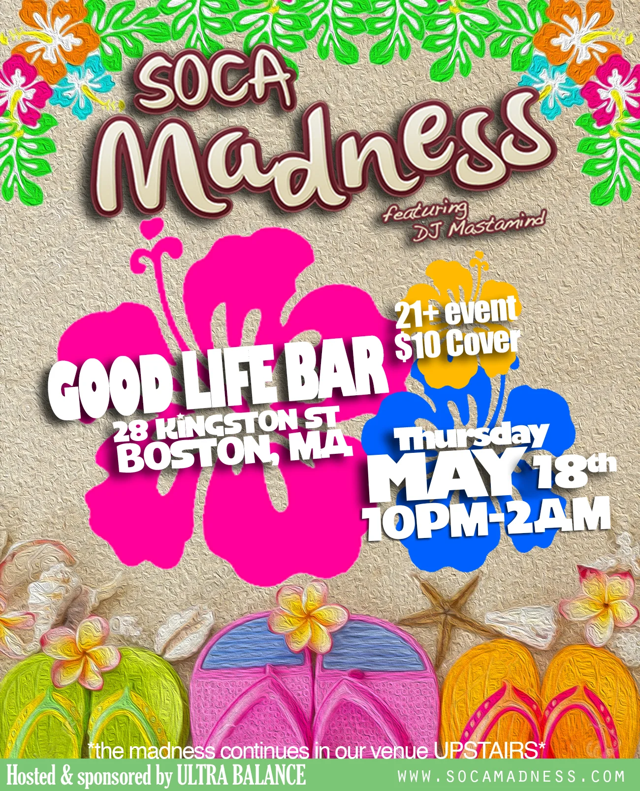 SOCA MADNESS Thursday, May 18, 2017 9:30β―PM 11:59β―PM 21:30 23:59 Google Calendar ICS Event: SOCA MADNESSDJ: MastaMindMusic: Soca, CaribbeanEnds at 2am