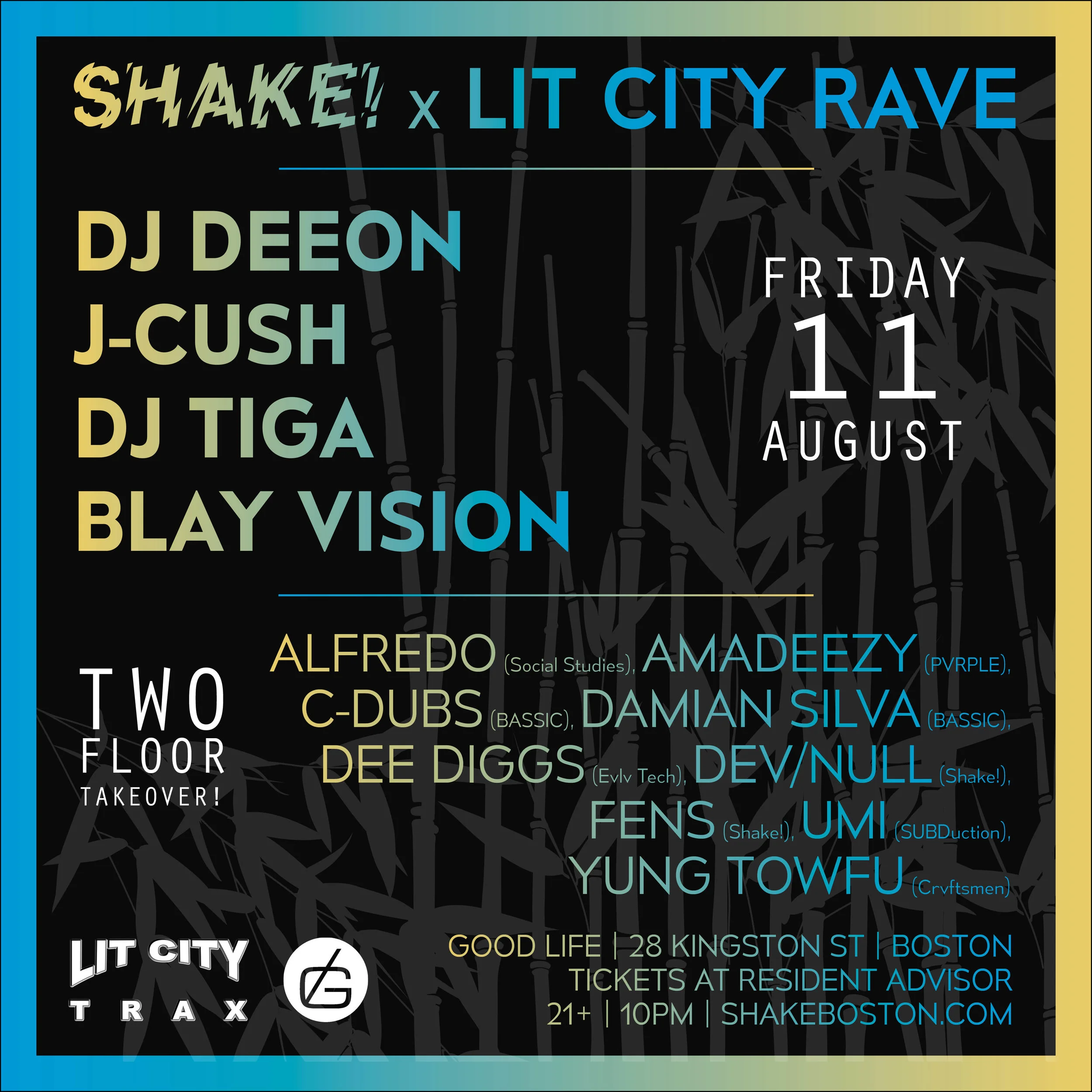 DJs: Deeon, J-Cush, Tiga, Blay Vision, Alfredo Amadeezy, C-Dubs, Damian Silva, Dee Diggs, Dev/Null, Fens, Umi, Yung Towfu